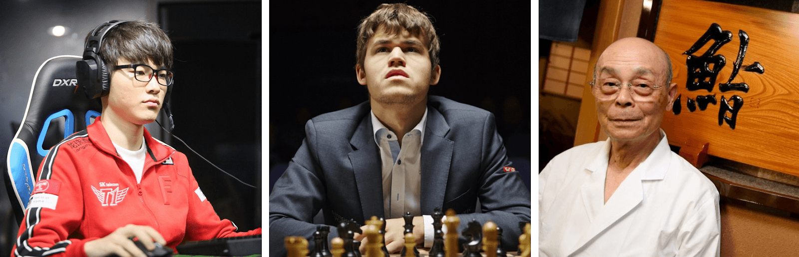 “I guess you can say I became the best, but I don’t think I’m that great yet.” - Faker “I am still far away from really knowing chess, really. There is still much I can learn, and there is much I still don’t understand. And this makes me motivated to keep going, to understand more and more and develop myself.” - Magnus Carlsen "I do the same thing over and over, improving bit by bit. There is always a yearning to achieve more. I'll continue to climb, trying to reach the top, but no one knows where the top is.” - Jiro Ono
